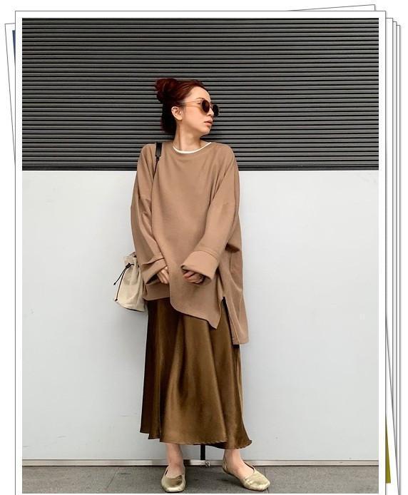 别致成熟的棕色运动衫,它非常宽大。你可以用一条光滑的缎面半身裙来完成造型。金色鞋子增添优雅气息。