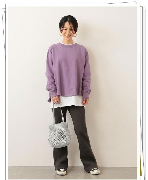 紫色的运动衫即使在休闲穿搭中也能带来精致的感觉。搭配春季罗纹裤,享受休闲造型。将白色的长T恤叠穿在里面,并露出领口和下摆,给造型增添了时尚感觉和鲜明的层次感。