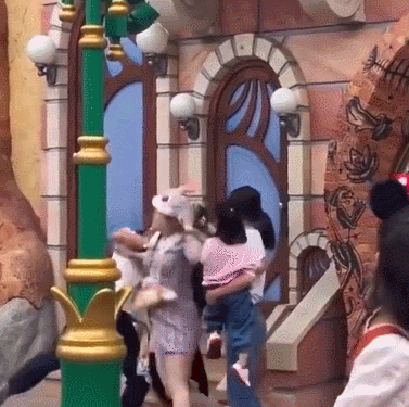 时间是5月31号傍晚,端午假期的第一天。地方在迪士尼疯狂动物城,那会人可不少,大家都挤着拍照、打卡,想留个纪念。一对年轻情侣,男生穿黑T恤,姑娘穿细格子短裙,戴着毛绒兔帽子,身上背着毛绒包包,一身打扮就是那种“乐园必备款”。旁边是一对夫妻,男的白T恤,女的怀里还抱着个两三岁的小女孩,粉色运动衫,萌萌哒。